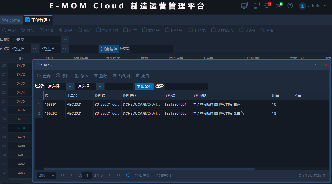 工單管理:MES系統根據ERP對接制令單,自動分配成工單管理,監控工藝流程、生產狀態、發料狀態、制程BOM表、報工數量。